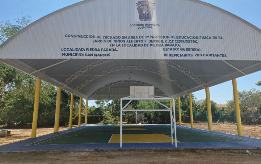 Antes de instalar los techos, se ensambla la estructura mediante la unión de vigas, columnas y soportes.